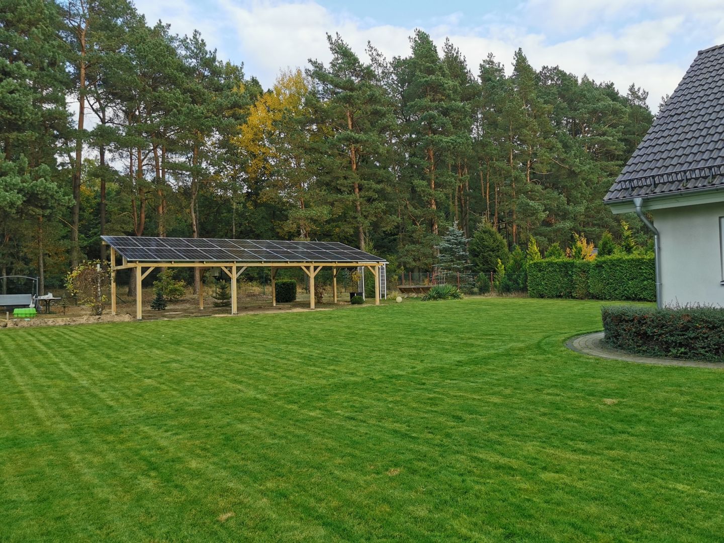 Wiata nie zajmuje przestrzeni ogrodowej i stanowi alternatywę dla instalacji gruntowych. Lepsza wentylacja paneli niż na dachu – wyższa wydajność.